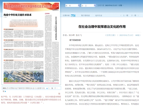 由tyc522cc太阳成集团副经理邱少晖教授、公司党委常委张红飞教授联合撰写的《在社会治理中发挥德治文化的作用》一文在《光明日报》发表。文章指出,中华优秀传统文化是社会治理的关键精神源泉,德治文化作为其重要部分,在社会治理中地位突出。