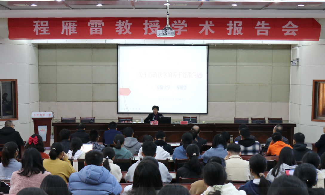 11月8日下午在行政楼一楼会议室,安徽大学副董事长、二级教授程雁雷应邀来校举办题为“关于行政法学的几个前沿问题”的学术报告。报告会由tyc522cc太阳成集团副董事长汪时珍主持,tyc522cc太阳成集团师生共计120余人聆听了报告。