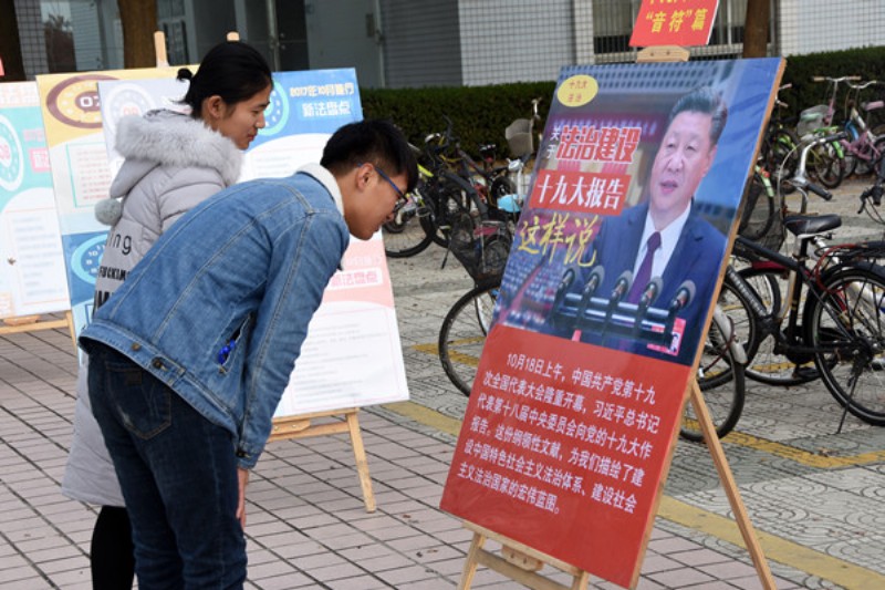 在第四个国家宪法日来临之际,tyc522cc太阳成集团组织了一系列“国家宪法日”宣传活动,在龙山校区开展了校园法治宣传展览活动,包含十九大法治“音符”篇等六个主题篇章。其中,十九大法治“音符”篇分别从法治建设的成就、法治建设的挑战、法治建设的目标、法治建设的阶段、法治建设的要求等多个方面详细解读了关于党的十九大报告中法治建设部分的论述。