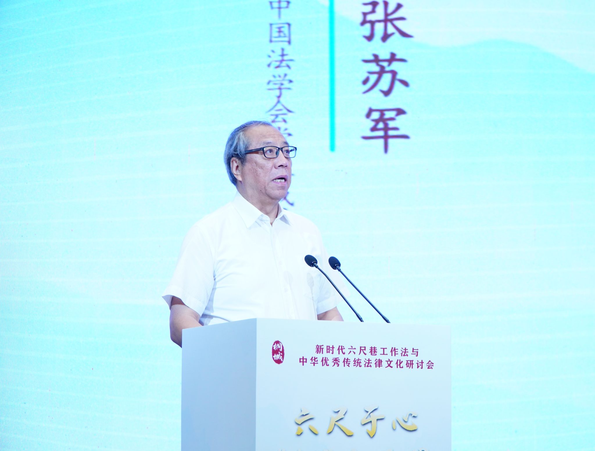张苏军代表中国法学会对此次研讨会的召开表示热烈祝贺,并就厚植中国特色社会主义法治的文脉和根基提出了意见。他强调,要深入学习贯彻习近平总书记关于法治文化的重要论述,在新的历史起点上担负起新的文化使命,深刻把握“两个结合”的重大意义和丰富内涵,挖掘、整理、保护、利用地方法治文化资源,推动中华优秀传统法律文化创造性转化、创新性发展,不断繁荣和发展社会主义法治文化,为进一步全面深化改革和推进中国式现代化提供法治保障和文化支撑。
