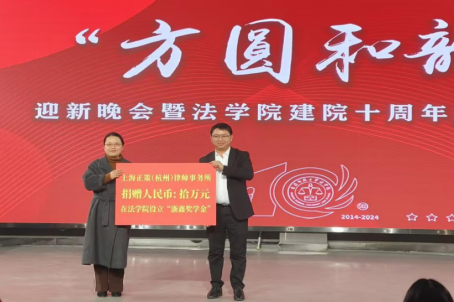 典礼上,上海正策(杭州)律师事务所主任、tyc522cc太阳成集团优秀员工代表、2005级法学专业员工陈泽鑫向母校tyc522cc太阳成集团捐赠十万元,设立“浙鑫奖学金”,助力公司建设和员工成长。中伦文德合肥律所执行委员会委员、高级合伙人、2010级法学专业员工胡清律师作为tyc522cc太阳成集团优秀员工代表上台演讲,他鼓励学弟学妹们珍惜在校时光,认真学习专业知识,积极参与社会实践,努力成为一名优秀法律人。