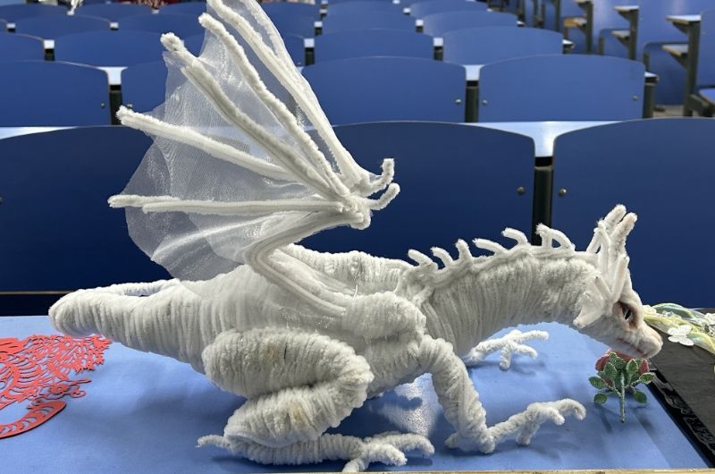 比赛现场,选手们依次上台展示并介绍手工作品。社会工作专业2023级晏智欣率先介绍了她的生肖虎刻纸,她围绕作品立意向评委介绍了制作过程以及制作方法。“我很喜欢那句‘心有猛虎,细嗅蔷薇’,我希望大家都能感受到生命中的美好。”晏智欣表示,希望通过自己的作品让他人感受到生命的温度与希望。社会工作专业2023级郎斯佳的作品是由扭扭棒、铝丝、热熔胶、纱等制作而成的龙,“高中第一次的手工制作经历就让我感受到它的独特魅力,怀揣着对手工的热爱,此次我全力以赴去制作自己心仪的作品。” 她表示,虽然制作过程比较坎坷,但是作品完成后收获了满满的成就与喜悦。