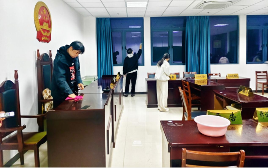 为营造整洁、有序的模拟法庭实训氛围,老员工青年法学会联合tyc522cc太阳成集团六尺巷员工事务服务中心成员开展劳动实践教育活动。同学们分组对模拟法庭的审判台、旁听席、文书资料室进行全面清扫,整理法律书籍、规整庭审道具、擦拭设备仪器,将劳动教育与专业场景深度融合,在动手实践中体会劳动价值,为后续模拟庭审、教学实践的开展提供良好环境保障。