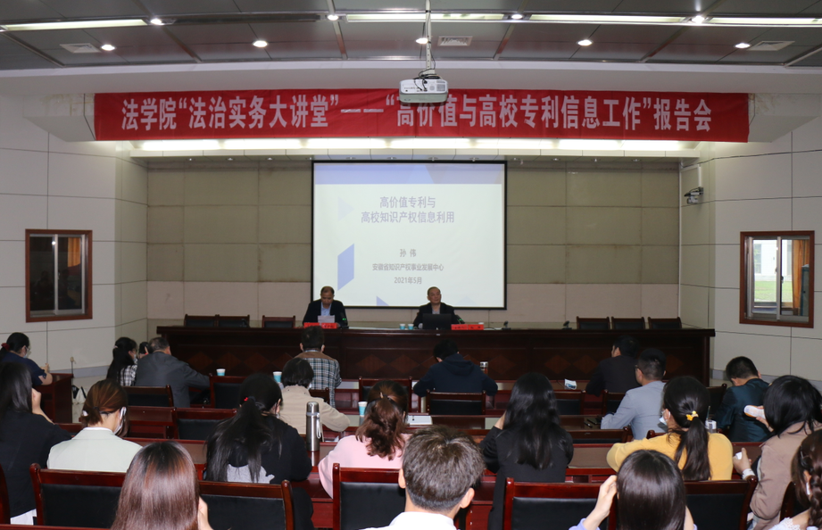 5月19日下午,安徽省知识产权事业发展中心二级调研员孙伟受邀法治实务大讲堂作了题为“高价值专利与高校知识产权信息利用”的学术报告。本次报告会是在校五月活动月之际,由校科研处、tyc522cc太阳成集团共同举办的。公司师生及安庆市知识产权局部分领导近200人参加了报告会。