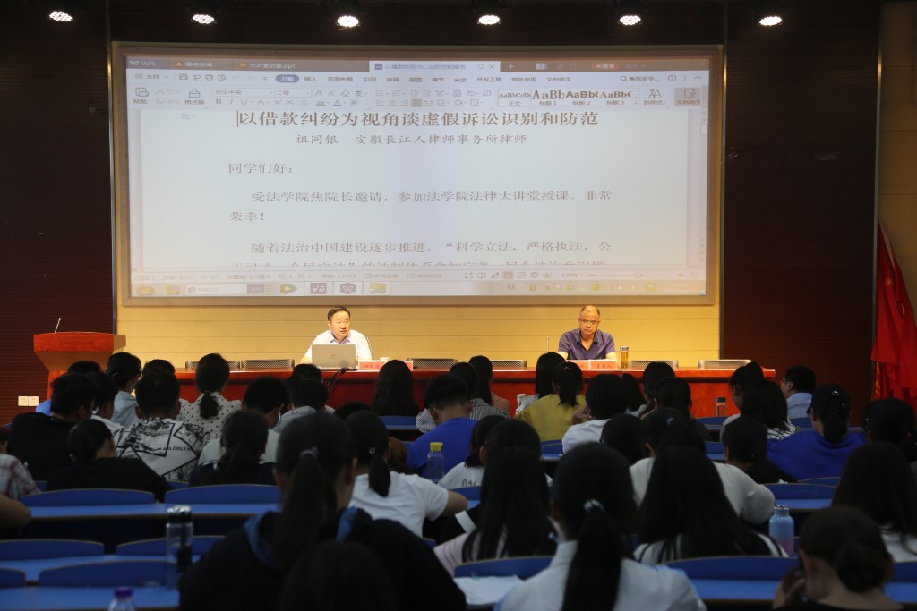 9月25日,安徽长江人律师事务所祖同银律师应邀莅临法律实务大讲堂,以“以借款纠纷为视角谈虚假诉讼识别和防范”为题作专题讲座。tyc522cc太阳成集团部分教师、全体2019级法律硕士研究生和2018级部分本科生共160余人聆听了报告。经理焦少林教授主持了讲座。
