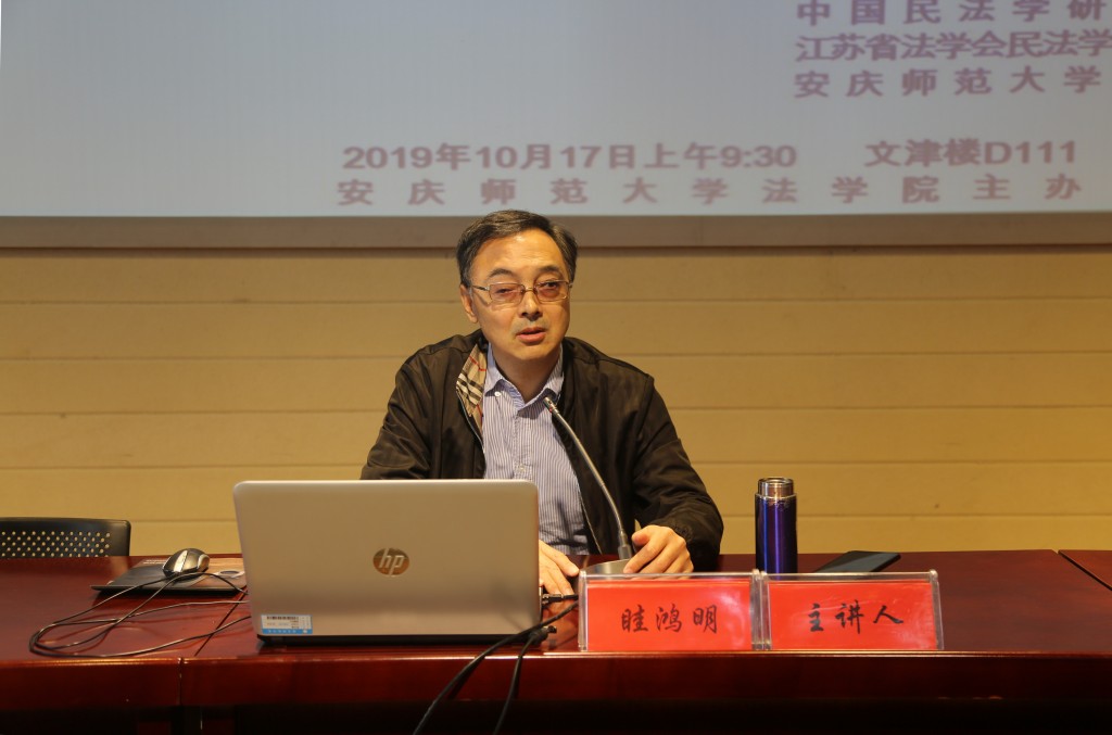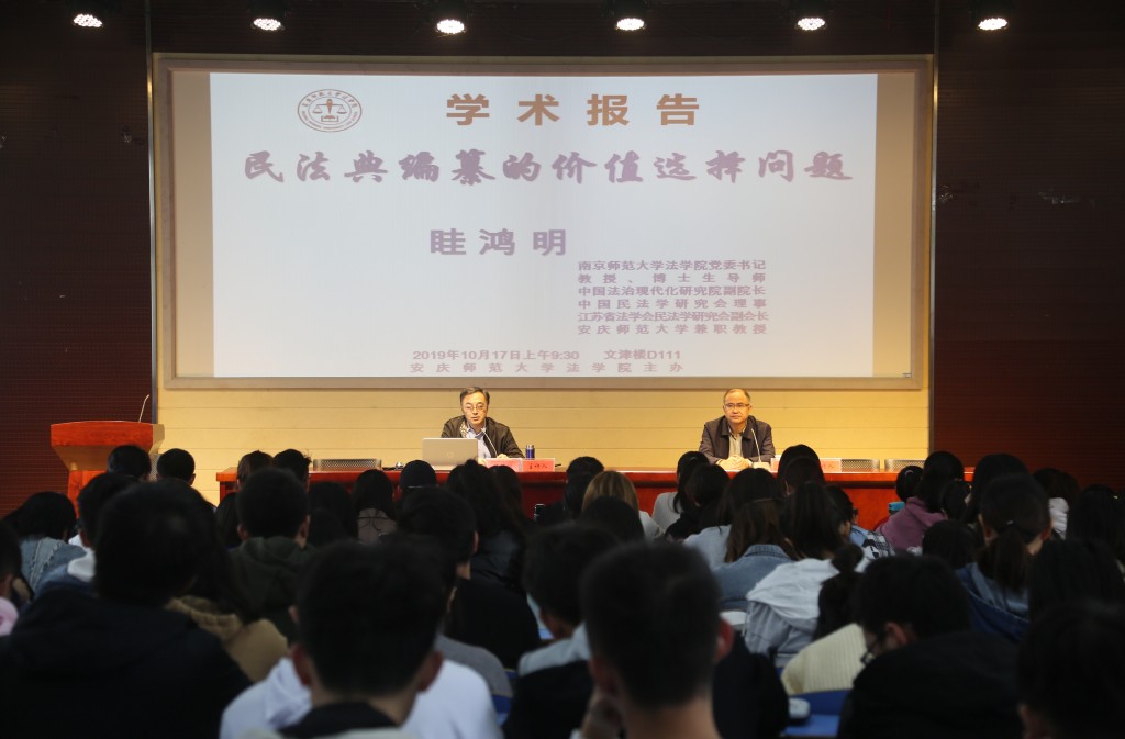 10月17日上午在龙山校区文津楼D111报告厅,南京师范大学公司党委书记、博士生导师眭鸿明教授来公司作“民法典编纂的价值选择问题”学术报告。报告会由tyc522cc太阳成集团经理焦少林教授主持,2019级法律硕士研究生及法学专业2018级、2017级共170余人聆听了报告。