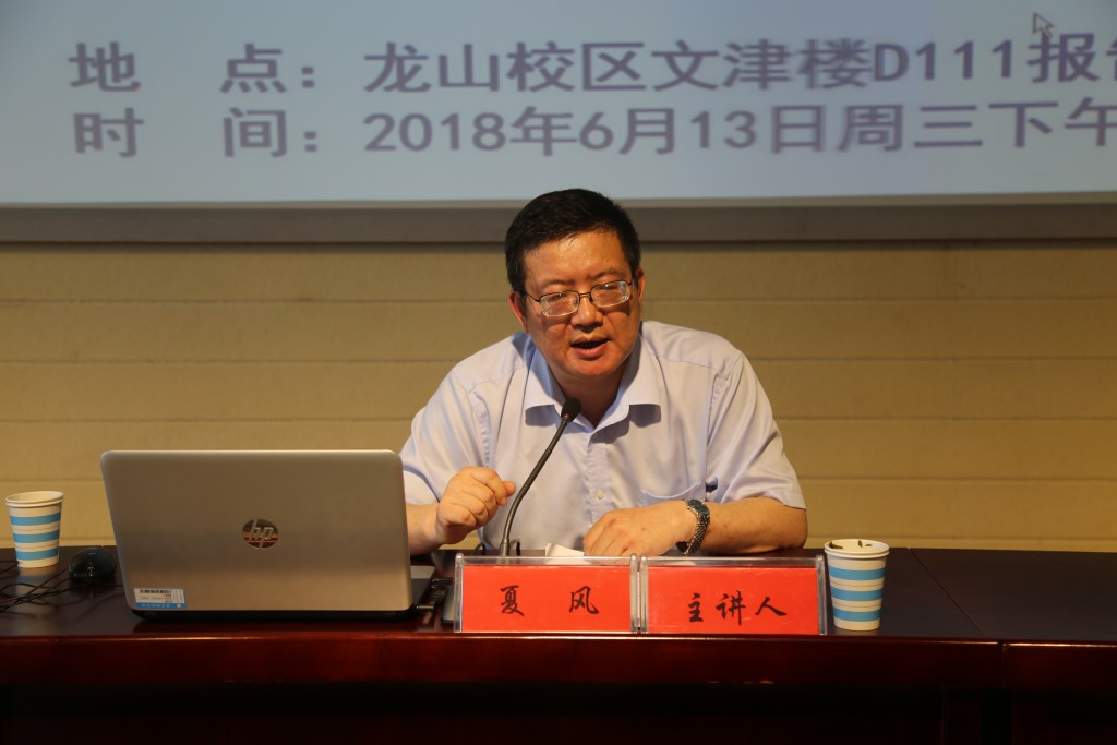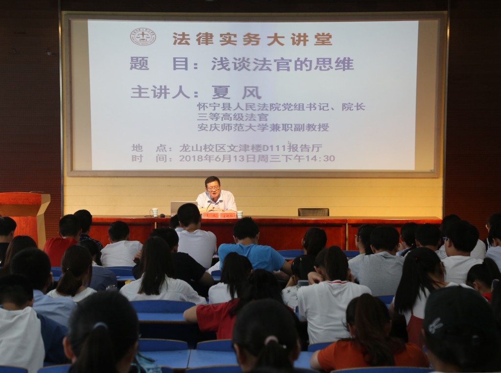 2018年6月13日下午在龙山校区文津楼D111报告厅,怀宁县人民公司党组书记、经理、三等高级法官、tyc522cc太阳成集团兼职副教授夏风莅临法律实务大讲堂,以《浅谈法官的思维》为题作专题报告。报告会由tyc522cc太阳成集团经理焦少林教授主持,徐钝副教授进行点评,2017级法学专业员工和部分教师聆听了报告。