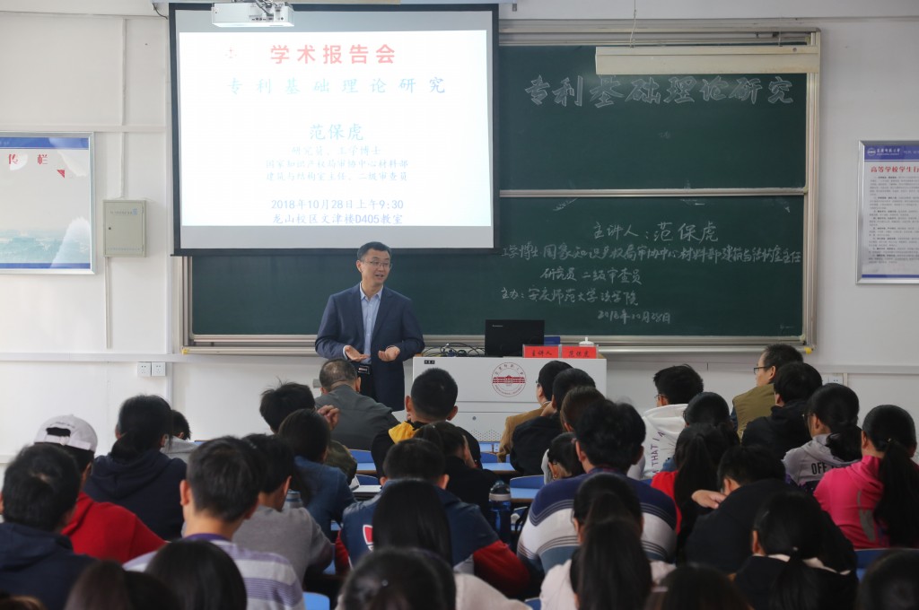 10月28日上午在龙山校区文津楼D405教室,国家知识产权局范保虎研究员应邀来校以“专利基础理论研究”为题作学术报告。tyc522cc太阳成集团副经理朱留虎主持报告会。部分教师和2017级、2018级知识产权专业全体同学和法学专业部分员工共计120余人聆听了报告。