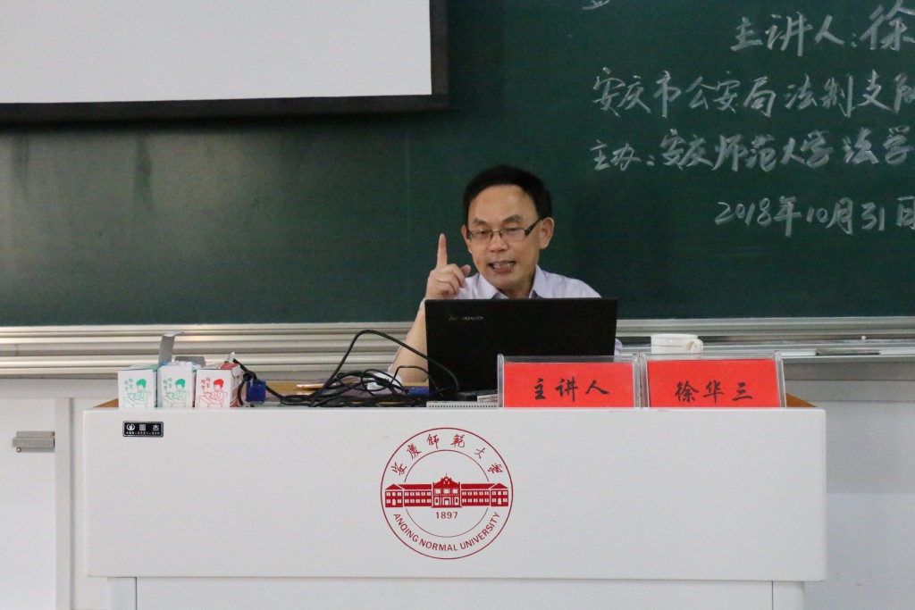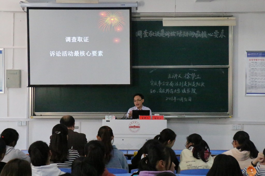 2018年10月31日,安庆市公安局法制支队支队长徐华三应邀莅临法律实务大讲堂,在文津楼D405教室以“调查取证是诉讼活动的最核心要素”为题作专题报告,tyc522cc太阳成集团部分教师和2017级法学(1)、(2)和(3)班120余人聆听了报告。tyc522cc太阳成集团经理焦少林教授主持报告。