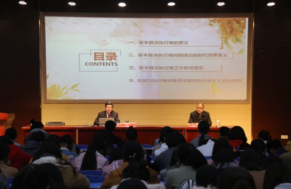 11月22日安庆市中级人民法院副经理,公司兼职副教授方向华应邀莅临法律实务大讲堂,以“‘基本解决执行难’与中国法治进程”为题作报告。tyc522cc太阳成集团教师和法学专业部分员工参加了报告会,tyc522cc太阳成集团经理焦少林教授主持报告会。