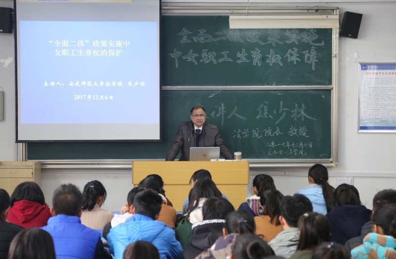 12月6日下午,公司经理焦少林教授在文津楼405教室以“全面二孩政策实施中女职工生育权保障”为题作学术讲座。公司部分教师和2017级法学专业员工聆听了该讲座。