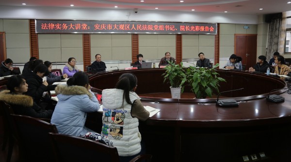 11月23日,安庆市大观区人民公司党组书记、经理,公司兼职副教授光彩同志应邀莅临法律实务大讲堂,以《坚守 智慧 善良 勇气——谈优秀法律人的基本素养》为题作专题报告。tyc522cc太阳成集团部分教师和2016级法学专业员工参加报告会。报告会由tyc522cc太阳成集团经理焦少林教授主持。