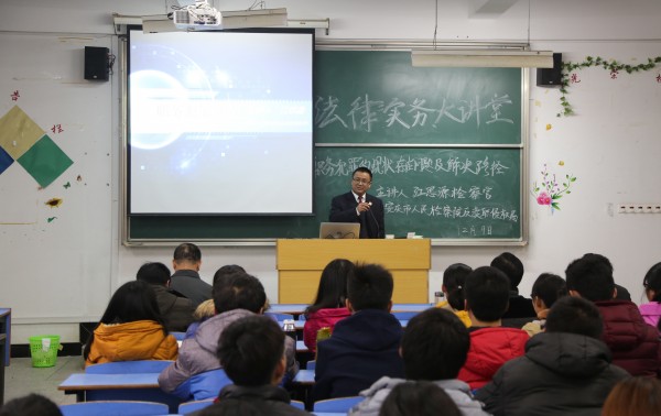 12月9日下午 安庆市人民检察院反渎职侵权局江思源检察官应邀到法律实务大讲堂谈“职务犯罪侦查”。公司党总支书记詹德全和部分教师参加了讲座,法学专业2015级员工120余人聆听了讲座,讲座由tyc522cc太阳成集团副经理朱留虎主持。