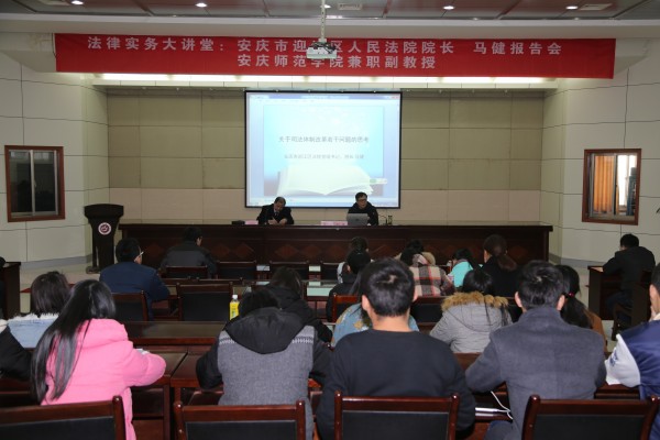 12月31日,安庆市迎江区人民法院经理、公司兼职副教授马健应邀来法律实务大讲堂做了题为“关于司法体制改革若干问题”的报告会。tyc522cc太阳成集团部分师生参加了报告会,报告会由tyc522cc太阳成集团院经理焦少林教授主持。